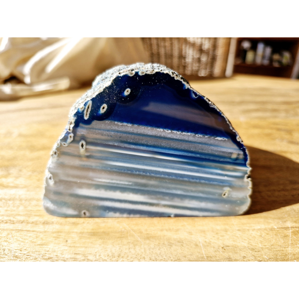Deze prachtig gestreepte blauw gekleurde theelichthouder uit Brazilië zorgt voor sfeervol licht dat je door de steen ziet schemeren. Lichtjes van edelsteen zorgen voor een aangename rustgevende sfeer.