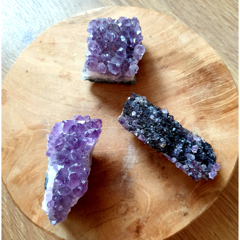 Mooie donkere ruwe amethist clusters uit Uruguay met een gewicht tussen de 80 en 125 gram. De stenen worden per stuk verkocht vanuit voorraad. De kleur van de steen kan iets afwijken van de foto.
