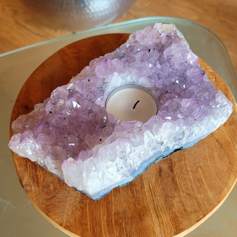 Een prachtig theelicht van ruwe amethist met een mooie golvende vorm.