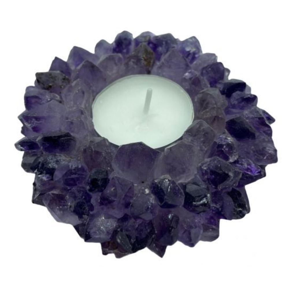 Deze prachtige theelichthouder is opgebouwd uit losse amethistkristallen en is met de hand gemaakt in Brazilë.