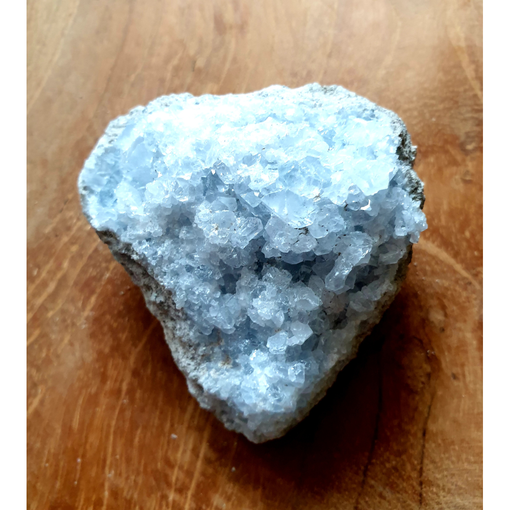 Cluster ruwe celestien van 6 bij 5 centimeter en 106 gram.