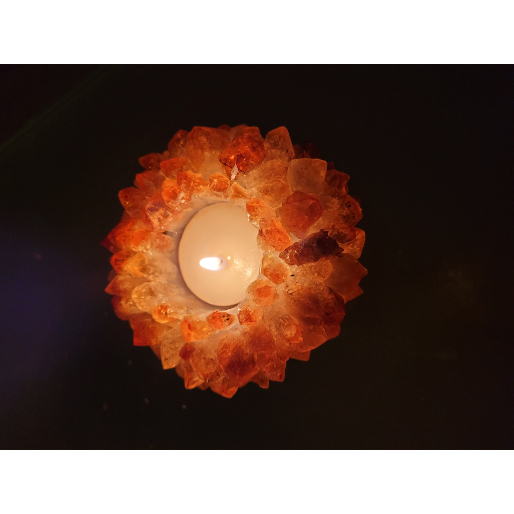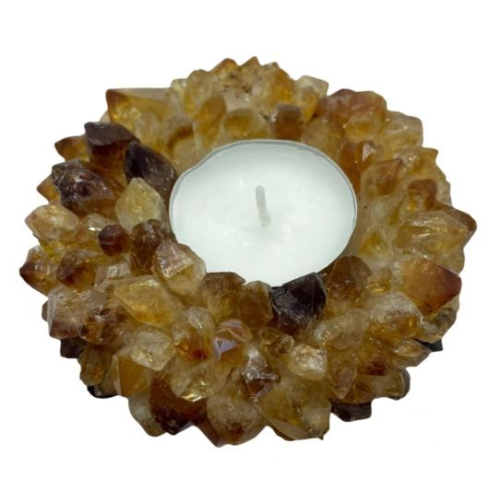 Deze prachtige theelichthouder is opgebouwd uit losse citrienkristallen en is gemaakt in Brazilë.