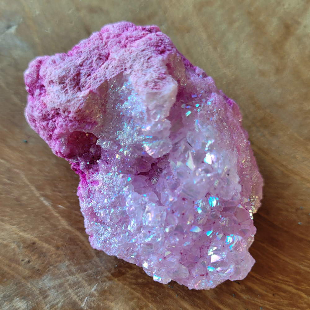 Cotton Candy Aura kwarts is bergkristal behandeld met Platinum. Dit geeft de steen naast de werkingen van de bergkristal nog extra krachtige eigenschappen.
