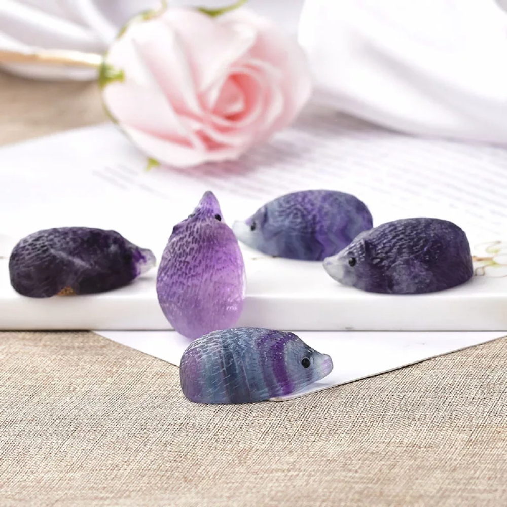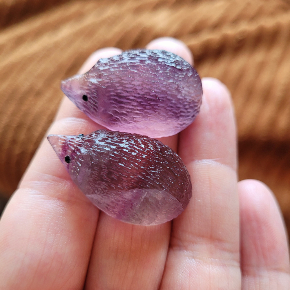 Deze schattige egeltjes zijn gemaakt van fluoriet. Elk egeltje is uniek en heeft zijn eigen kleurenpatroon. De egeltjes zijn zo'n 3,5 bij 2 centimeter.