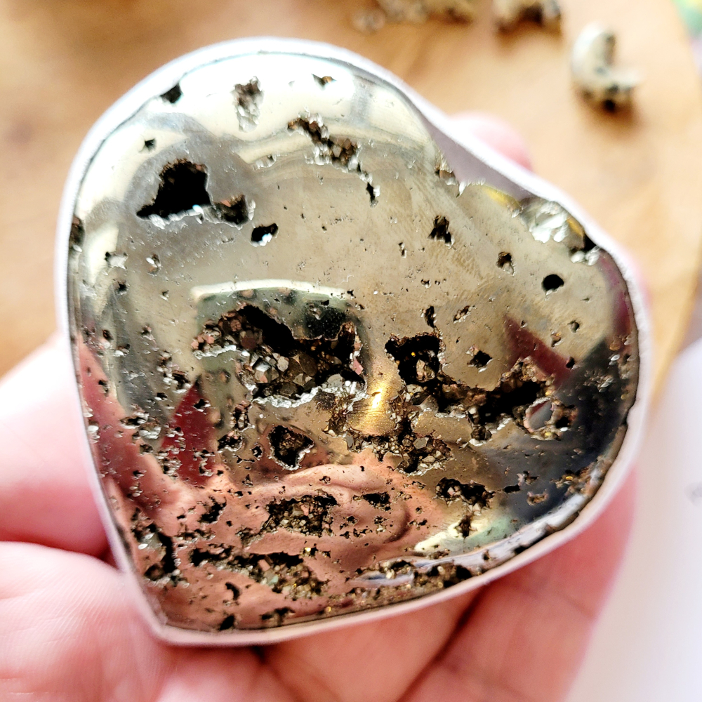 Een prachtig gebold hart van pyriet met mooie openingen waardoor je de vierkante kristallen goed kunt zien. Dit hart komt uit Peru en weegt 213 gram.Je koopt het stuk van de foto.