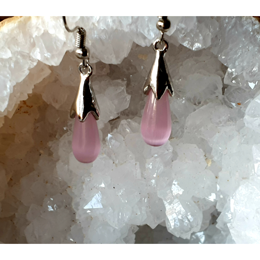 Subtiele oorbellen van roze opaal. De oorbellen zijn gemaakt van zilver sterling 925. Ze worden ook wel kattenogen genoemd vanwege de witte streep door het roze. De oorbellen zijn klein. Van het hoogste punt van de oorhanger tot aan de onderkant van de steen meten ze 4 cm.