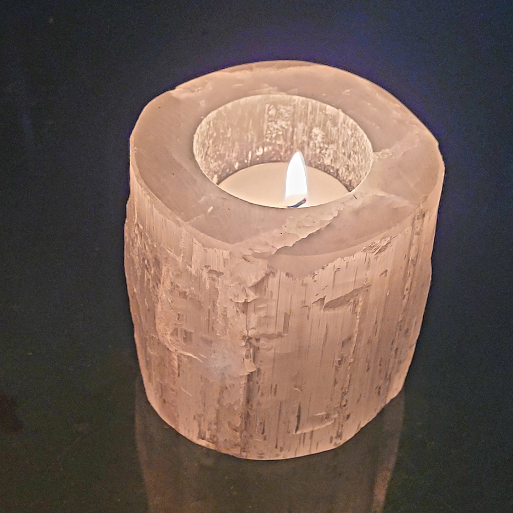 Prachtige theelichthouder van Seleniet in cilindervorm.